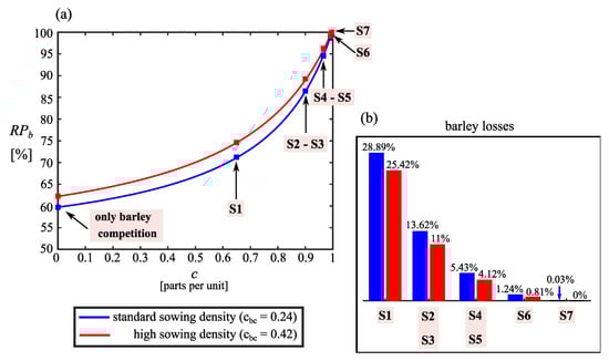 Barley yield when the ryegrass achieved its long-term equilibrium level under different control programs and sowing densities. (a) Relative production respect to Sb,max; (b) Loss percentages corresponding to control programs S1–S7.