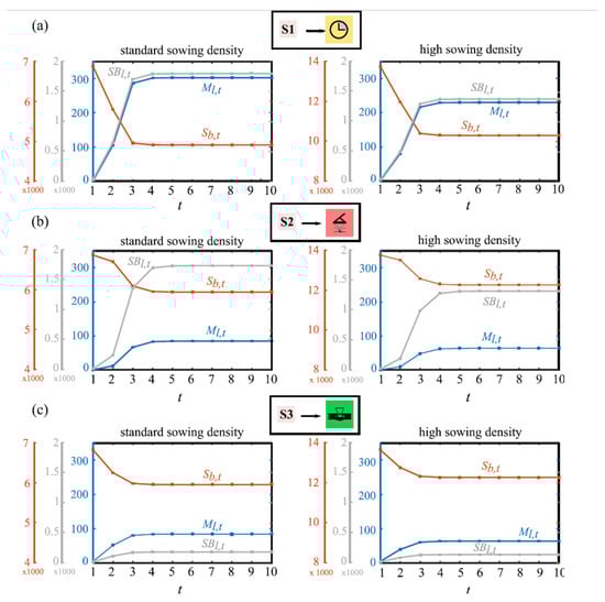 Simulations of the weed–crop model over a ten-year planning horizon applying different individual control programs and considering standard and high sowing density. L. rigidum mature plant population Ml,t in blue; barley seed production Sb,t in orange; L. rigidum seed bank SBl,t in gray. (a) S1; (b) S2; (c) S3.