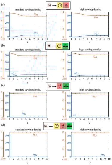 Simulations of the weed–crop model over a ten-year planning horizon applying different integrated control programs and considering standard and high sowing density. L. rigidum mature plant population Ml,t in blue; barley seed production Sb,t in orange; (a) S4; (b) S5; (c) S6; (d) S7.