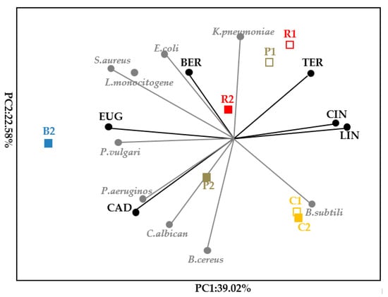 PCA points at the probable relationship between the content of particular compounds in BEOs and the antimicrobial activity. It seems that a higher share of eugenol can be related to increased inhibition of P. vulgaris, E. coli, S. aureus, L. monocitoges, P. aeruginosa, and C. albicans. A higher share of α-trans-bergamotene seems to be related to antimicrobial activity against E. coli, S. aureus, and L. monocitogenes, while higher epi-α-cadinol share seems to be related toantimicrobial activity against P. aeruginosa, P. vulgaris, B. sereus, and C. albicans. No direct relationship between an increased share of linalool, 1, 8-cineole, or α-terpineol andantimicrobial activity of BEOs againstspecific microorganismscould be noted from PCA.