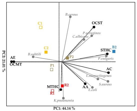 The relationships between classes of compounds in BEOs and antimicrobial activity depend on basil production factors. (Classes of compounds: OCMT, oxygen-containing monoterpenes; MTHC, monoterpene hydrocarbons; STHC, sesquiterpene hydrocarbons; OCST, oxygen-containing sesquiterpenes; AE, aliphatic esters; AA, aliphatic alcohols; and AC, aromatic compounds. Shading nets and harvests: C1 and C2, non-shaded first and second harvest; R1 and R2, red net first and second harvest; P1 and P2, pearl net first and second harvest; and B2, blue net second harvest).