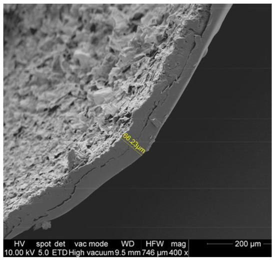 The investigations conducted by an environmental scanning electronic microscope (ESEM) allowed us to define the thickness (66.23 µm) of the double coating layer of CH–EO of F. campestris utilized in the research for the protection of the bean seeds (Figure 2).