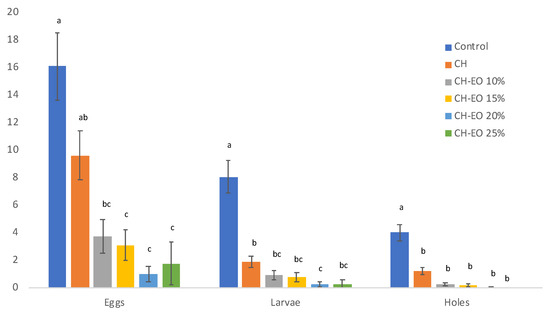 In vitro protective effect of chitosan and chitosan plus Ferulago campestris essential oil (EO) against reproductive activity of females of Acanthoscelides obtectus. Histograms (y axis) represent the mean values of eggs, larvae, and larval entrance holes. Bars represent standard error. Control, untreated beans; CH, chitosan coated beans; CH–EO beans coated with chitosan added with EO at different percentages; different letters indicate significant differences according to Dunn–Bonferroni pairwise comparisons test (p ≤ 0.05).