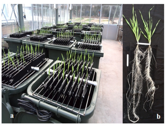 Layout of barley plants grown in the semi-hydroponic phenotyping system (a), and plants of two barley genotypes with contrasting root systems grown for 30 days after transplanting (b) in a temperature-controlled glasshouse. Bar = 10 cm.