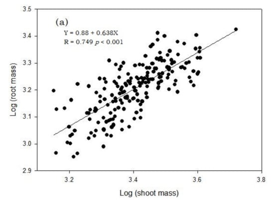 Pearson correlation matrix was used to identify correlation among different parameters. A subset of 13 root traits and three shoot parameters were selected with relatively large CV values (CV ≥ 0.25; Table 2). There was significant correlation among most individual traits (Table 3). Root biomass was highly correlated (p < 0.01) with each of 14 traits, except for root length ratio (RLR). Root biomass was strongly correlated with shoot biomass (r = 0.741, p < 0.001, Figure 3a), shoot height, root length in different soil layers and tiller number (Table 3). As expected, total root surface area (RA) and total root volume (RV) showed similar correlations as root biomass: however, root diameter (RD) had no significant correlation with RA, RV or root length.