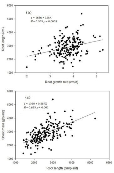 There were strong correlations between root length and other root-related parameters, including growth rate of the longest root (Figure 3b) and shoot mass (Figure 3c).