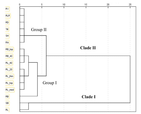 The hierarchical cluster analysis using the average linkage method between groups separated the same subset of 16 traits into two major clades. Clade I included SB and RL, and Clade II were further divided into two groups (Figure 4). The dendrogram indicated the relationship among the selected traits.