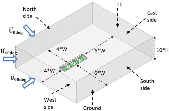 Here, is the inlet velocity profile (in m s), is the chosen velocity (in m s) at the height (in m) and is a power coefficient (dimensionless). The value of = 0.16 was extracted from wind tunnel measurements. The value chosen for the ground roughness was 0.068 m, which corresponded to a moderately rough terrain and helped to conserve the form of the ABL profile []. The distances 4 W for the inlet and 6 W for the outlet were chosen so that the boundary conditions are far away enough to not influence the flow inside the barn. The domain boundary conditions were set in relation to the inflow air angle. Table 1 shows the details.