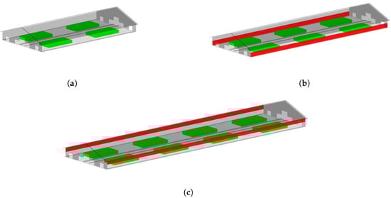 3 of the 9 possible barn configurations for the study, the AOZs in green and the curtain in red. (a) barn = 2 without curtain, (b) barn = 3 with curtain “open up”, (c) barn = 4 with curtain “open down”.