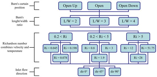 Figure 3 shows the scheme of the parameters composition and their corresponding values. Due to this composition and the resulting diverse cases, the study required an enormous number of CFD simulations. The use of the RANS model with the porous model, instead of the RANS with fully resolved cows, reduces the computational time enormously, but the number of resulting cases is still very high. It was obvious that manually launching each simulation run with manual parameter settings was not an option. For this reason, we used the user interface (UI) provided by ANSYS and developed a fully automated workflow based on a combination with Python (3.6.4) and BATCH scripts. We coupled a Python homemade script to modify a so-called ANSYS journal file to provide the parameter values for the simulation. The journal records ANSYS commands in a text user interface (TUI) format and can be re-run to automatically execute the recorded commands.