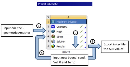 The ANSYS internal workflow is described in Figure 4. The main script first called out ANSYS and implemented the mesh (already prepared by the user) in step 1. A loop was executed for this mesh. In the loop, the journal file was modified according to the boundary conditions (, and ), the CFD simulation was executed in ANSYS Fluent (setup and solution) and, as a second step, the post-processing (analysis of the simulation results) was performed in CFD-Post. In step 3, the AER of the barn and the local AERs were calculated internally in ANSYS and then written to a CSV file. In step 4, the journal was modified by implementing new boundary conditions and then the script returned to step 2. The loop (steps 2-3-4) was run until the simulations for all boundary conditions and were completed. Next, one of the nine cases (3 3· curtain positions = 9 possible geometry cases) were run in step 1, and so on. By fully automating the process, a significant time-saving was achieved and the probability of human typing errors was drastically reduced.