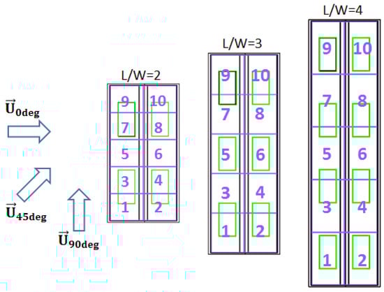 The AER was evaluated globally, for the barn as a whole, and locally, for each box of the subdivision. To gain a deeper understanding of the local AER, we decided to virtually divide the barn into 10 parts (or volumes) relative to the barn sizes (L/W = 2, 3 and 4). The dimensions of the boxes are as follows: L = L/5, W = W/2, H = 2 × H = 3.2 m. These virtual subdivisions can be observed in Figure 5. We numbered the boxes to identify their position relative to the incoming airflow. The AER is calculated through the equation:
