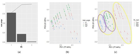 PCA and clustering for the AER of the barn, (a) is the percentage of variance explained by the PCs, (b) is the datapoints displayed in the first two PCs’ orthogonal system and colored according to the three levels of the inlet angle, (c), similar to (b), but this time the datapoints are colored with respect to the three different convection types: forced (For), mixed (Mix) and natural (Nat).