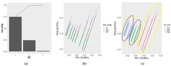 PC for the 10 boxes’ subdivision. (a) is the percentage of variance explained by the PCs, (b) is the datapoints displayed in the first two PCs’ orthogonal system and colored according to the three levels of the inlet angle, (c), similar to (b), but this time the datapoints are colored with respect to the three different convection types: forced (For), mixed (Mix) and natural (Nat).