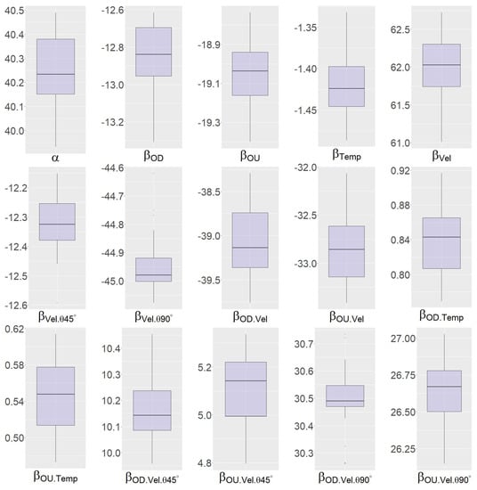 We tested how well the equation with those coefficients can predict the remaining 5% of the data by looking at the and RSE. This operation is repeated n times (in our case n = 20). We consequently obtained a series of and (with ). To provide an idea of how much the fitted model depends on the selection of training data, we chose to plot a distribution for each coefficient as a boxplot in Figure 8 for the group “all”. The reference for each coefficient boxplot was the coefficients from the 100% data (the coefficients of Table 4, first horizontal line, group “all”). Looking at Figure 8, we observed that the individual coefficients diverge very little from their reference values. The mean over the 20 tests was equal to 0.984 (0.985 and 0.983) for the 95% training data and 0.975 (between 0.911 and 0.993) for the 5% test data.