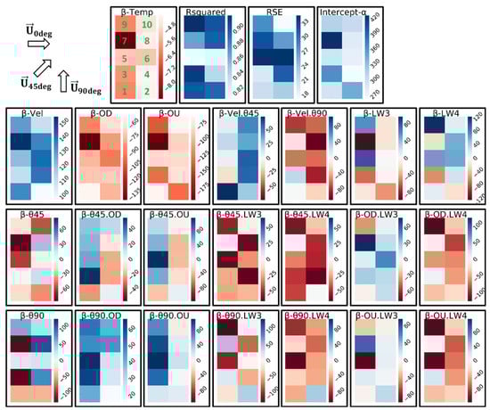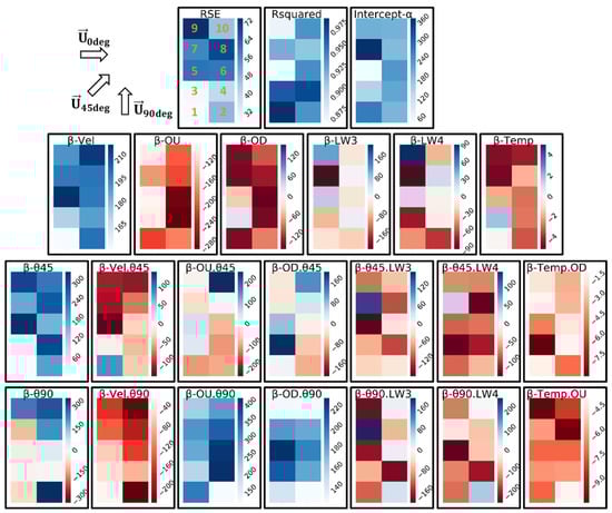 It is worth noting that the average of the over the ten boxes is equal to 0.93 (between 0.86 and 0.98), which is lower than the 0.98 for the Equation (9) on the general AER, but still translates to a good fit with the data. All and RSE values, as well as the coefficients and for the boxes are summarized in Figure 9. The chosen color code is dark blue—white—dark red to easily distinguish the variation between the boxes. When, for a single coefficient, all box-values are positive, the minimum value is associated with the white color and the maximum value with dark-blue. For the opposite case, when all box-values are negative, the maximum value is associated with white and the minimum with the dark-red. Finally, for the case when the box-values are both positive and negative, dark-blue was assigned to the maximum, white to zero and dark-red to the minimum. The following points summarize the conversations on the influence of each parameter on the individual boxes: