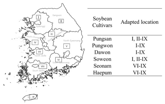 The field experiment was conducted at the Agricultural Research and Extension Center in South Jeolla province, South Korea, during the soybean growing seasons of 2003–2018 (35°1′19.35”N, 126°38′29.65”E). Six soybean sprout cultivars (‘Pungsan’, ‘Pungwon’, ‘Dawon’, ‘Soweon’, ‘Seonam’, and ‘Haepum’) were used in this study. These cultivars were mainly grown in South Korea. These six cultivars have adapted to different agroecological regions of South Korea, as shown in Figure 1. According to NICS [19], Pungwon and Dawon cultivars have geographically adapted to all provinces, while Seonam and Heapum have only geographically adapted to the southern regions of Korea. Pungsan and Soweon have also adapted geographically to all provinces except the Gangwon province.