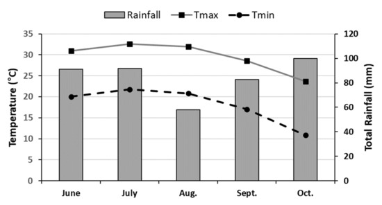 According to the National Institute of Agricultural Science, RDA (available online at http://soil.rda.go.kr/soil/soilmap/characteristic.jsp (accessed on 28 June 2021)), the soil type was Sikyangtong (CL, clay loam). During the soybean growing season (June–October), the average temperature and total rainfall were 23.80 °C and 423.3 mm, respectively. The maximum temperature, minimum temperature, and total rainfall during the soybean growing season (June–October) averaged over 2003–2018 are shown in Figure 2.