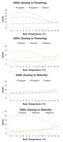 CVs of the GDDs for each cultivar were calculated by varying base temperatures (0–15 °C) and incorporating intermediate phenological stages (sowing to flowering and sowing to maturity) (Figure 3). The calculated values of CVs for some base temperatures in each phenological stage are summarized in Table 4.