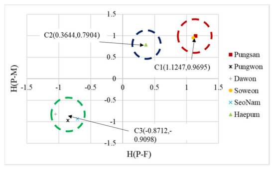Based on the clustering analysis, three soybean sprout groups were created, as shown in Figure 4. Group 1 included Pungsan and Soweon; Group 2 included Haepum; and Group 3 included Pungwon, Dawon, and Seonam. Centroids of Group 1, Group 2, and Group 3 were C1(1.1247, 0.9695), C2(0.3644, 0.7904), and C3(−0.8712, −0.9098), respectively. As shown in Figure 4, three groups had different characteristics in terms of GDDs.