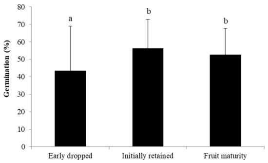 Percentage of avocado pollen germination on the stigma of different flower groups established based on fruit abscission data. Error bars are ± standard deviations. The same letter indicates no statistically significant differences at p < 0.05 (GLM analyses followed by Tukey HSD test).