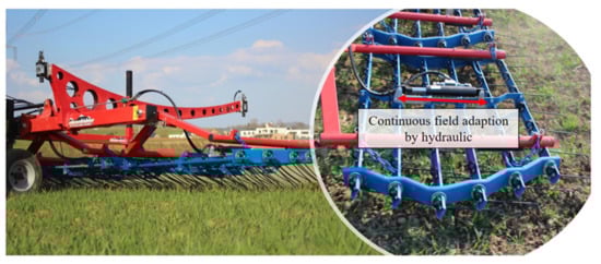 The working mechanism of harrowing implies a whole field cultivation within and between crop rows, and therefore, it needs to be balanced between maximum weed control and minimal crop damage. The selectivity, described as the ratio between the percentage of WCE and the percentage of crop soil cover (CSC) immediately after harrowing [6,7], is a suitable parameter to evaluate the success of post-emergence harrowing. If the intensity of weed harrowing is too low, WCE and CSC are both low and consequently, selectivity is also low. If the intensity is too high, WCE and CSC are high, which again causes a low selectivity. A high selectivity in cereals is only achieved if CSC remains constantly in the range around 20%, which the crop can compensate for by higher growth rates after harrowing [8,9]. The intensity of weed harrowing can be varied by changing the tine angle, tine diameter, driving speed, and the number of passes across the field [7,10,11]. The problem of conventional harrowing is that the intensity is usually set once at the beginning of the treatment. The initial intensity is then kept constant for the whole field. Under heterogenous field conditions, however, conventional harrowing with a fixed intensity may cause crop damage at locations with light soils and less crop coverage and low WCE in areas with high crop coverage and heavy soils. Therefore, harrow intensity needs to be adjusted continuously to achieve high selectivity over the entire field.