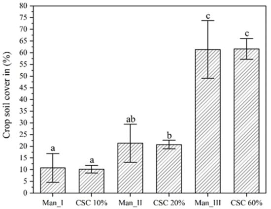 Mean crop soil cover (CSC) and standard deviation measured in Eningen and Hirrlingen in 2020 after harrowing in three conventional and three automatic settings, p = 0.0034. Means with the same letter were not significantly different according to the HSD-test at α ≤ 0.05. Man_I = low conventional adjustment of tine angle (10°); Man_II = medium conventional adjustment (tine angle 40°); Man_III high conventional adjustment (tine angle 70°); CSC 10% = threshold for automatic adjustment, soil burial 10%; CSC 20% = threshold for automatic adjustment, soil burial 20%; CSC 60% = threshold for automatic adjustment, soil burial 60%.