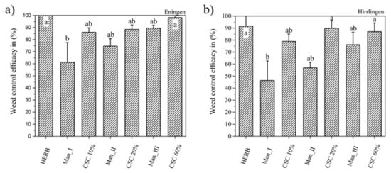 Percentage of weed control efficacy in spring oats in Eningen, p = 9.489 × 10−16 (a) and winter wheat in Hirrlingen p = 2.064 × 10−5 (b) in 2020. The measurement was done directly after treatment, only the herbicide treatment was measured 14 days after application. Means with the same letter were not significantly different according to the HSD-test at α ≤ 0.05. HERB = herbicide application, conventional intensity (Man_) I, II, and III = tine angle 10°, 40°, and 70°; Crop soil cover (CSC) 10, 20, and 60% = plant burial by 10, 20, and 70% soil. The error bars show the standard deviation.