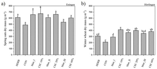The above-ground plant biomass of 1 m2 in each plot was cut shortly before flowering. The plants were separated into crops and weeds and then placed in a drying chamber for 48 h at 80 °C. Only data for dry crop biomass are shown, because weed biomass was close to zero in all treatments and locations.