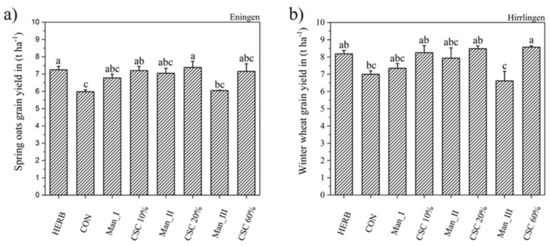 Grain yield (t ha−1) of spring oats in Eningen, p = 0.0039 (a) and winter wheat in Hirrlingen, p = 0.0032 (b) in 2020. Means with the same letter were not significantly different according to HSD-test at α ≤ 0.05. HERB = herbicide application, CON = untreated control, conventional intensity (Man_) I, II and III = tine angle 10°, 40° and 70°, Crop soil cover (CSC) 10, 20, and 60% = plant burial by 10, 20 and 70% soil. The error bars shows the standard deviation.