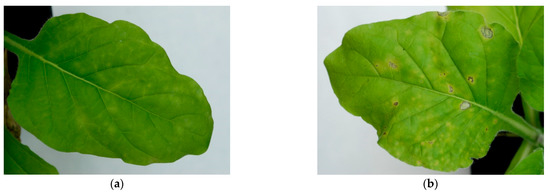 The PVY inoculum consisted of leaves of infected plants, ground in a mortar with a small amount of distilled water. The TSWV inoculum preparation required a phosphate buffer (9.078 g/L of KH2PO4 and 11.867 g/L of Na2HPO4) with 0.5% mercaptoethanol [55]. Infection of plants was carried out under the same conditions and in the same manner for both viruses. An appropriately prepared inoculum was rubbed on carborundum-strewn leaves of test plants at a volume of approximately 1 mL of inoculum per plant. The inoculated plants were protected from direct sunlight for 48 h. Plants inoculated only with buffer were also included in the study for comparison with virus-inoculated plants. Observation of disease symptoms and photographic documentation were systematically performed.