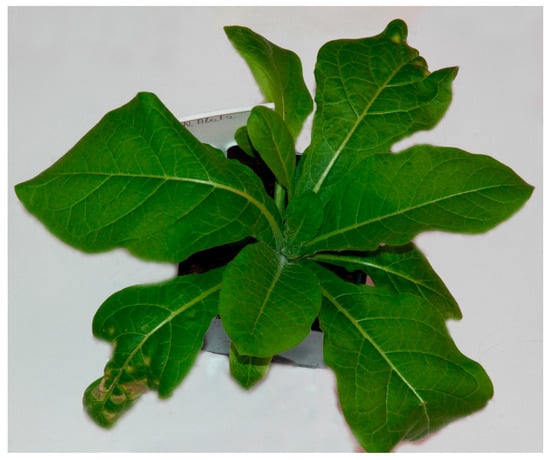 Another very important viral disease of tobacco is tomato spotted wilt caused by the Tomato Spotted Wilt Virus (TSWV), also known as Lycopersicum virus 3. This poses a significant threat to tobacco, as well as to many other species belonging to 85 botanical families [39]. This virus belongs to the genus Orthotospovirus, of the family Tospoviridae [40,41]. It is transmitted by several species of thrips [42], including tobacco thrips (Thrips tabaci). Initial disease symptoms include chlorotic and necrotic spots and, as the virus moves through the plant, there is stunted growth and a characteristic bending of the stem tip by about 45° [43]. TSWV causes a decrease in the yield of leaves, their quality and their technological usefulness. High intensity of infection may even necessitate plantation liquidation. The control of thrips is the most effective disease control strategy [44]. In the case of plants that are already infected with the virus, thrip control will not stop the development of the disease but may limit further spread. The only effective method of protecting tobacco against TSWV is the cultivation of resistant cultivars [9].