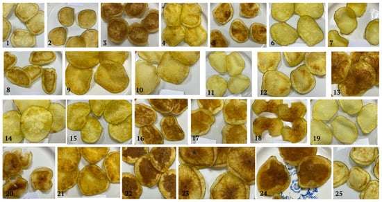 According to the results (Table 8), only the sample with selection number SH19 has excellent quality of crispy potatoes (7–9 points). Crispy potatoes with selection number SH15 have relatively high quality (6–8 points), and samples SH11, SH6, SH7, SH10 and SH14 are moderately suitable for chip production (6–7 points). Samples with selection numbers SH17 and SH24 scored less than 3 points and are not suitable for chip processing at this stage of the evaluation.