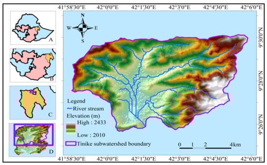 The study was conducted in Tinike sub-watershed, Haramaya district, East Hararghe zone, Oromia Regional State (Figure 1). The watershed lies between 9°22′03″–9°27′12″ north latitude and 41°58′14″–42°05′26″ east longitude, at an altitude range of 2010–2433 m above sea level. About 71% of the watershed is characterized by undulating and rolling topography [25]. The slope, landform and the configuration of the hills and peaks surrounding the Watershed have created a drainage network that takes the surface flow towards Lake Tinike from different directions. The mean annual rainfall is 801 mm and the daily temperature ranges from about 10 to 25 °C and the annual mean temperature is 17 °C (Haramaya meteorological station).