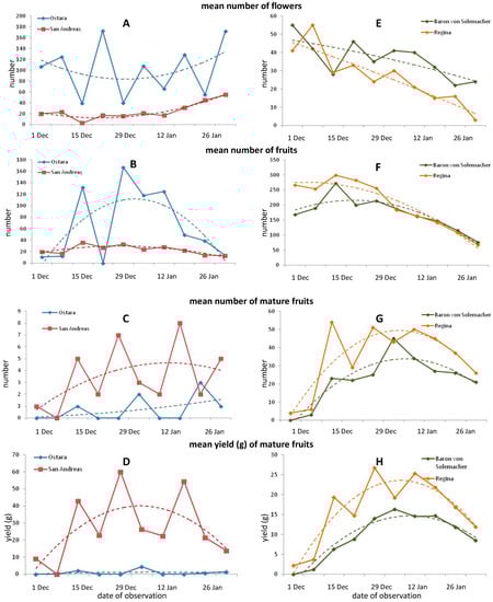 Flowering and yield data from weekly measurements in strawberry (A–D) and wild strawberry (E–H). (A) and (E)—mean number of flowers per plant; (B,F)—mean number of fruits per plant; (C,G)—mean number of mature fruits per plant; (D,H)—mean fresh weight (g) of the mature fruit. Dotted lines represent polynomial trends for particular parameters and cultivars.