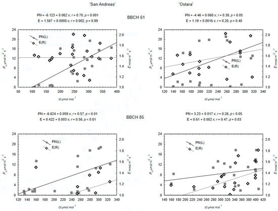 Directional convergence of the two processes was confirmed by the coefficient of correlation (r—Pearson) and linear regression (Figure 3). At the BBCH 61 stage, a significant and positive correlation was found between the concentration of intercellular CO2 and photosynthetic rate for ‘San Andreas’ (r = 0.70, p < 0.001 with the slope b = 0.062), and for ‘Ostara’ (r = 0.38, p = 0.05 with the slope b = 0.068). Stabilization of the processes was observed between Ci and transpiration rate, with a nonsignificant correlation between them in both cultivars studied at BBCH 85 stage. The same pattern for both cultivars with increasing correlations between Ci and PN/E was noted at BBCH 85 stage with the r = 0.56–0.57 for ‘San Andreas’ and r = 0.26–0.47 for ‘Ostara’.