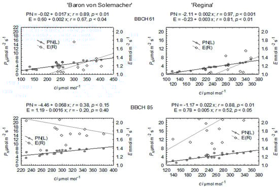 Coefficient of correlation (r—Pearson) and linear regression described the model of two processes between the concentration of intercellular CO2 and PN/E parameters at two growing stages for both cultivars studied (Figure 4). At the BBCH 61 stage, significant and positive correlations were found between the concentration of intercellular CO2 and the photosynthetic rate in ‘Baron von Solemacher’ (r = 0.89, p < 0.01 with the slope b = 0.017) and in ‘Regina’ (r = 0.97, p < 0.001 with the slope b = 0.002). Stabilization of the processes was observed between Ci and transpiration rate, with a significant correlation between them for both cultivars at BBCH 61 stage. A significant correlation for ‘Baron von Solemacher’ amounted r = 0.67, p < 0.04 with the slope b = 0.002, and the cross point for Ci = 362 μmol mol−1, while for ‘Regina’, it has reached Ci = 335 μmol mol−1. A different pattern for both cultivars was detected at stage BBCH 85. Increasing and significant correlations between Ci and PN/E were reported for ‘Regina’ only, while for ‘Baron von Solemacher’, the nonsignificant negative correlation r = −0.20 and nonsignificant positive correlation with the r = 0.38 were found.