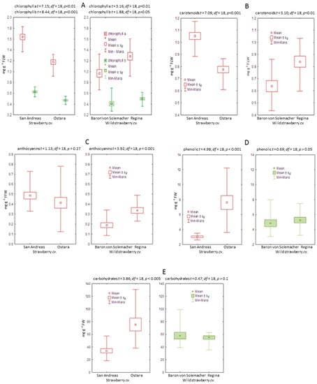 Box-plots of the content of chlorophylls a and b in fresh leaves (A), carotenoids in fresh leaves (B), anthocyanins in fresh fruits (C), phenolics in fresh fruits (D), and carbohydrates in fresh fruits (E) of strawberry and wild strawberry.