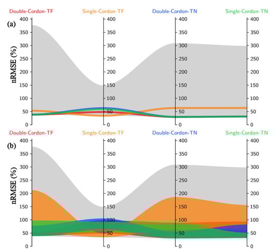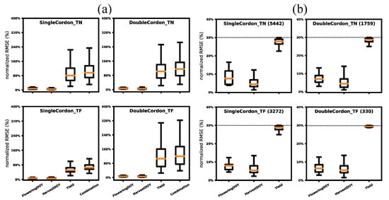 Based on the distribution of the nRMSE under each parameter value (Figures S2–S5), we presented its minimum (Figure 2) and range values (Figure 3) based on the objective function. Parameters minimizing the sum of the nRMSE show a slightly better performance for TN (31.0% and 29.5%) than for TF (33.9% and 38.2%) between the single- and double-cordon systems (Figure 2). These minimum values are identical throughout the parameters, serving as the criteria to choose the parameter values with the best possible fit. For instance, FF1500 is preferably chosen rather than FF900 for TN with the double-cordon system (Figure 2b). On the other hand, the overall prediction variability can be reduced if certain parameter values are used; e.g., FN0.5 rather than FN2.5 can reduce the spread of the nRMSE from 240% to 92% (Figure 3a). Comparatively, the total variability is smaller for TF with the single-cordon system (Figure 3c), also reflected in Figure 1a, which may be due to its relatively small variation in yield data (Table 1). The parameters can thus be selected to potentially have less dispersion (“noise”) in the predictions. However, in most cases, the parameter values that minimize the spread do not simultaneously minimize the nRMSE (Figure 2 and Figure 3).