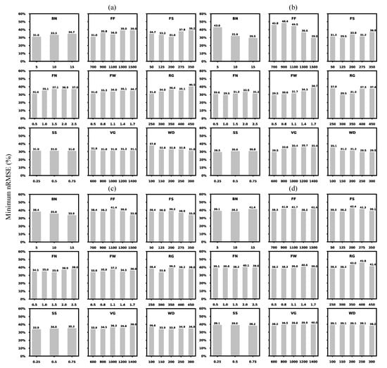 Minimum value of the STICS model prediction uncertainties (nRMSE, %) based on the combined variable (i.e., objective function) under each parameter value (fix a given parameter value and test the remaining combinations). (a) Touriga Nacional (TN) with the single-cordon training system; (b) Touriga Nacional (TN) with the double-cordon training system; (c) Touriga Franca (TF) with the single-cordon training system; (d) Touriga Franca (TF) with the double-cordon training system. The parameter abbreviations are denoted for each subplot (see Table 2 for detailed parameter descriptions). The associated boxplots are shown in Figures S2–S5. The calibrated parameters are BN: Box number; FF: Fruit filling thermal requirement; FS: Fruit setting thermal requirement; FN: Fruit number formation potential per degree day−1 per cluster; FW: Fruit (berry) weight potential; RG: Thermal requirement between budbreak and reproductive onset; SS: Source sink ratio threshold; VG: Thermal requirement between juvenile onset and veraison onset; WD: Thermal requirement between reproductive onset and fruit water dynamic onset.