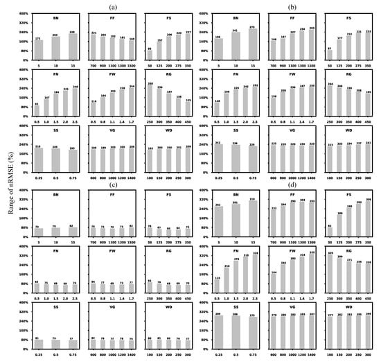 Range of STICS model prediction uncertainties (nRMSE, %) based on the combined variable (i.e., objective function) under each parameter value (fix a given parameter value and test the remaining combinations). (a) Touriga Nacional (TN) with the single-cordon training system; (b) Touriga Nacional (TN) with the double-cordon training system; (c) Touriga Franca (TF) with the single-cordon training system; (d) Touriga Franca (TF) with the double-cordon training system. The range (spread) is calculated as four times the inter-quartile range (the associated boxplots are shown in Figures S2–S5).