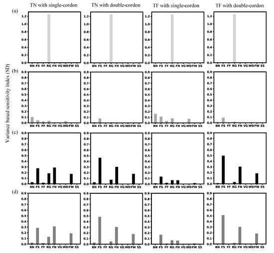 The variance-based sensitivity index is calculated for each variety–training system combination based on the variance of the total prediction uncertainty (nRMSE, %) over the response variable of (a) flowering date; (b) harvest date; (c) yield; (d) combined variable (i.e., objective function). The index denotes the main effect index, which can rank the relative importance of each parameter in terms of its individual effect on the total variance of the prediction uncertainty (nRMSE, %). Parameter abbreviations are labelled on the x-axis with detailed parameter descriptions in Table 2.
