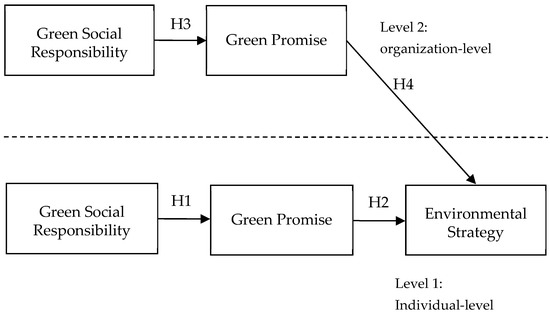 Previous studies [22,23,24] have examined corporate social responsibility and affective commitment at the organization level through the theory of the multilevel method [25], so GSR and GP should also have a similar context. For example, the organization-level GSR and GP are the atmosphere that is overspread within the group and are shared by people within the group [26]. In other words, individual-level GSR affects individual-level systems (e.g., individual-level GP and ES) when organization-level GSR affects organization-level systems (e.g., organization-level GP), which explains unique variations in different levels. Also, according to the theory of social learning [27], we pose that individual-level ES is affected by the organization-level and individual-level GSR and GP at the same time. Thus:
