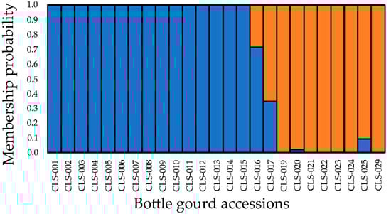 Bar plot of the estimated population structure of 25 L. siceraria accessions (k = 2). The vertical bars of the y-axis represent the estimated membership probability of each population to the subgroups. The blue and orange color represent different subgroups, and the x-axis is the bottle gourd accession codes. Populations with colored segments indicates admixed origin.
