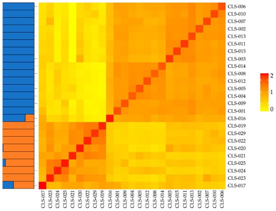 Kinship heatmap showing the genetic relationship among the 25 accessions of L. siceraria based on 71,212 SNPs markers with two main groups. One group is composed by accessions of South African geographical origin, and the other corresponds to an admixture group with accessions of different geographical origin (Asia and South America). Red and orange colors indicate higher kinship and yellow colors indicate lower kinship. CLS-001 to CLS-015 correspond to accessions of South Africa; CLS-016 and CLS-017 correspond to accessions of Brazil; CLS-019 to CLS-022 correspond to accessions of Asia; and CLS-023, CLS-024, CLS-025, and CLS-029 correspond to accessions of Chile.