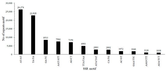 We used high-quality read pair count sequences derived from GBS data to identify SSR loci in a collection of 25 bottle gourd accessions. The search for SSR-containing regions was restricted to motif of di-, tri-, tetra-, penta-, hexa-, and heptanucleotides. A total of 95,635 SSRs loci with di-, tri-, tetra-, penta-, hexa- and heptanucleotide repeats of 5 or more repeats were identified from the GBS data. These SSR loci consisted of 69,682 dinucleotide repeats (72.86%), 21,641 trinucleotide repeats (22.63%), 3203 tetranucleotides repeats (3.35%), 599 pentanucleotide repeats (0.63%), 356 hexanucleotide repeats (0.37%), and 154 heptanucleotides repeats (0.16%) (Table 4). Dinucleotides and trinucleotides were identified as the most abundant SSR class, representing the 95.49% of the SSR motif classes. The repeat motif AT/AT (26,274) was the most frequent in the dinucleotide SSR, representing 37.71% of the total dinucleotides, and the repeat motif AAT/ATT (7592) was the most frequent into the trinucleotide SSR, representing 31.08% of the trinucleotides (Figure 4).