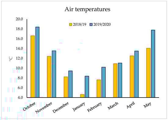 Mean monthly air temperatures from planting (October) to harvest end (May) in the 2018/19 and 2019/20 cropping seasons in Scanzano Jonico, Southern Italy. Data were obtained from a meteorological station located nearby the trial site belonging to the Basilicata Region (Centro Funzionale Decentrato (CFD), Regione Basilicata).