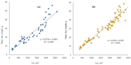 Relationship between plant leaf area (LA, cm2) and dry weight (DW, g) in the first (a) (left) and the second-year (b) (on the right) trials.