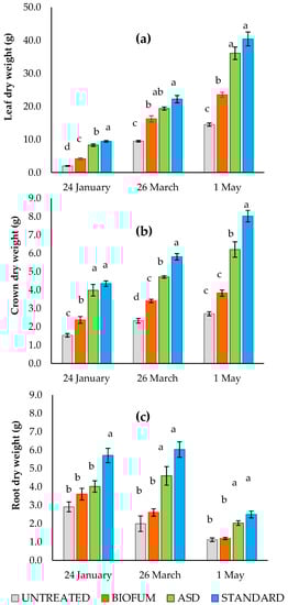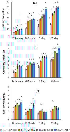 In the four treatments, while leaf and crown DW increased during the sampling period (Figure 3a,b), root DW decreased (Figure 3c). Specifically, root DW decreased continuously in the plants of UNTREAT and BIOFUM plots, while in ASD and STANDARD plots values were stable in the first two sampling dates and decreased significantly in the sampling of 1 May.