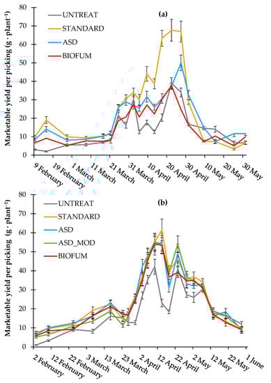 The 2018/2019 harvest season lasted 111 days and was completed in 20 pickings (Figure 5a). Harvest frequency, i.e., the interval time between one picking and the following, was usually of 4–5 days. In all treatments, most of the crop (≥75% out of total yield plant−1) was harvested between 25 March and 1 May pickings (37 days). The 2019/20 cropping season was similar for duration and number of pickings to the previous one (Figure 5b); however, the harvest curve pattern in the second year was more gradual and without the sharp harvest peak of the previous year, presumably due to the more regular and favorable climatic conditions before and along the harvest period.